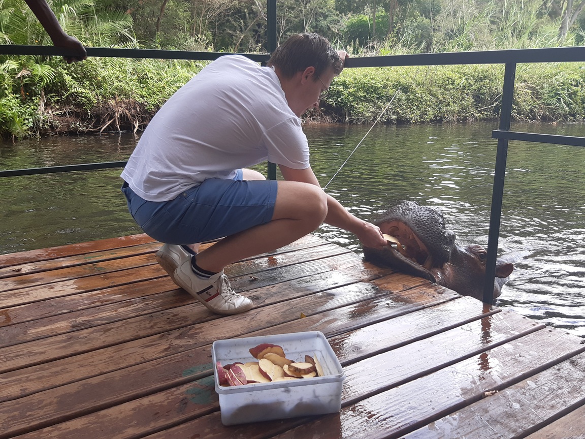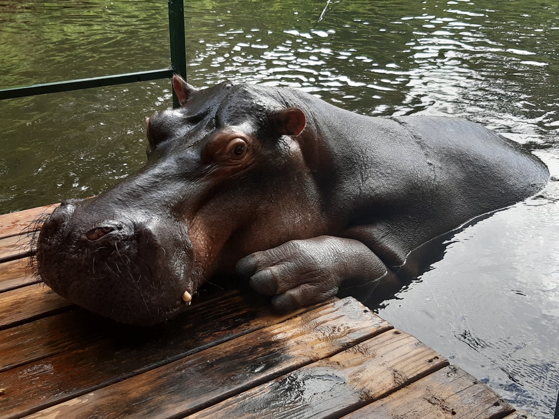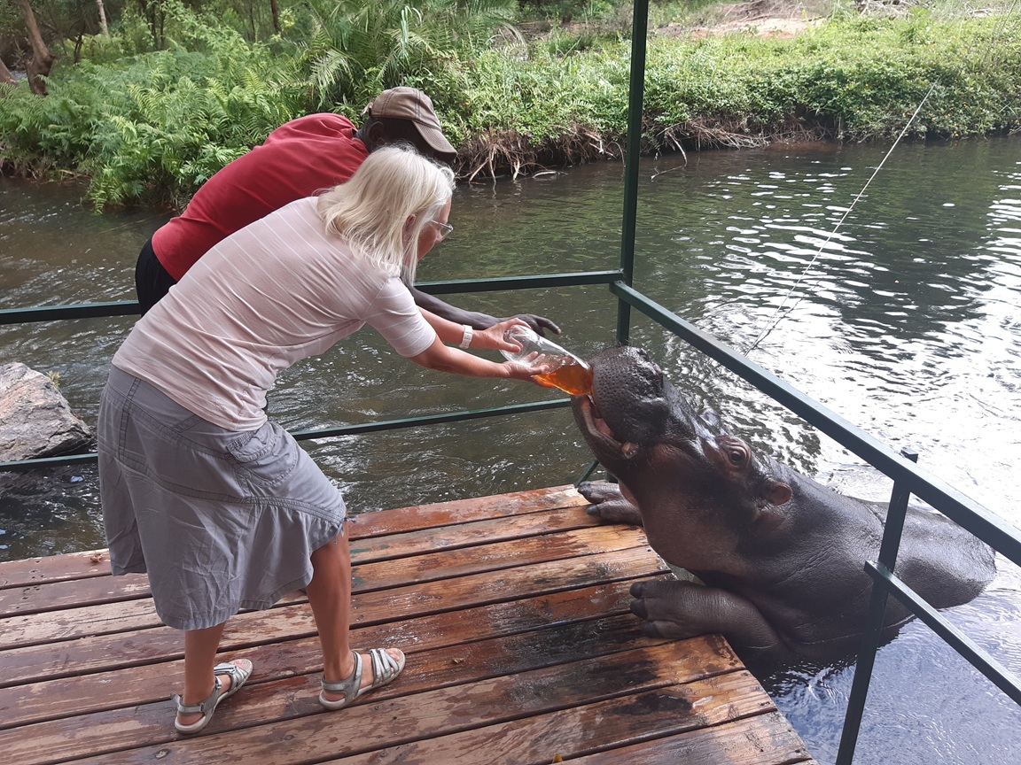 Další den jsem se vypravil za Jessicou. :) Jessica je rozhodně nejznámější hroch v celé Africe a pán, který ji s ženou jako malé mládě našel, dokonce říká, že je neznámější na světě. :) Jessicu našli zhruba před 20 let bez matky a rozhodli se, že ji zkusí zachránit - no a dnes už je Jessice cca 20 let, je dospělá a velká :), ale má dost jiný přístup k lidem - nechá se od nich nakrmit i trochu pohladit. :) Což vzhledem k tomu, že hroch je považován za nejvíce nebezpečné zvíře v Africe, je rozhodně HODNĚ výjimečné. :) Jessicu jsem navštivil vůbec poprvé a tady je :):