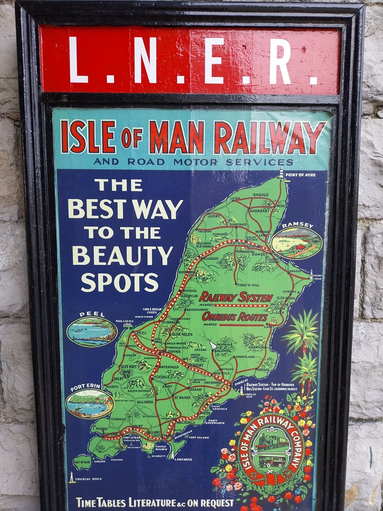 Místní cedule zvoucí na ostrově Man na cestování po železnici :):