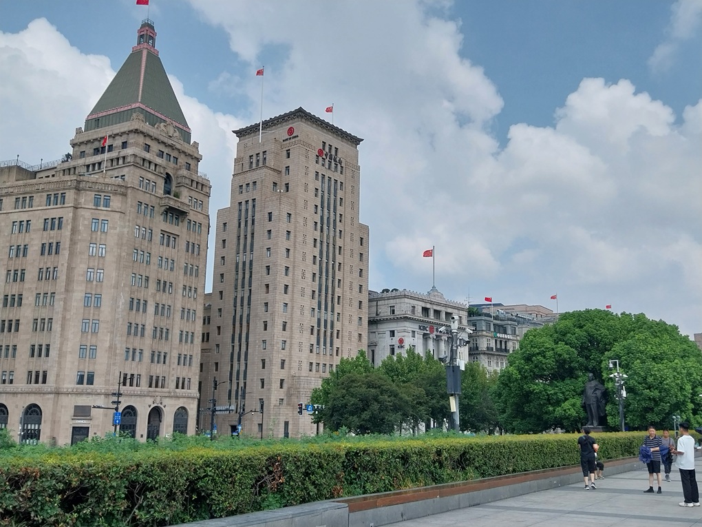 U vyhlídky Bund jde pak vidět na budovách spousta červených čínských komunistických vlajek: