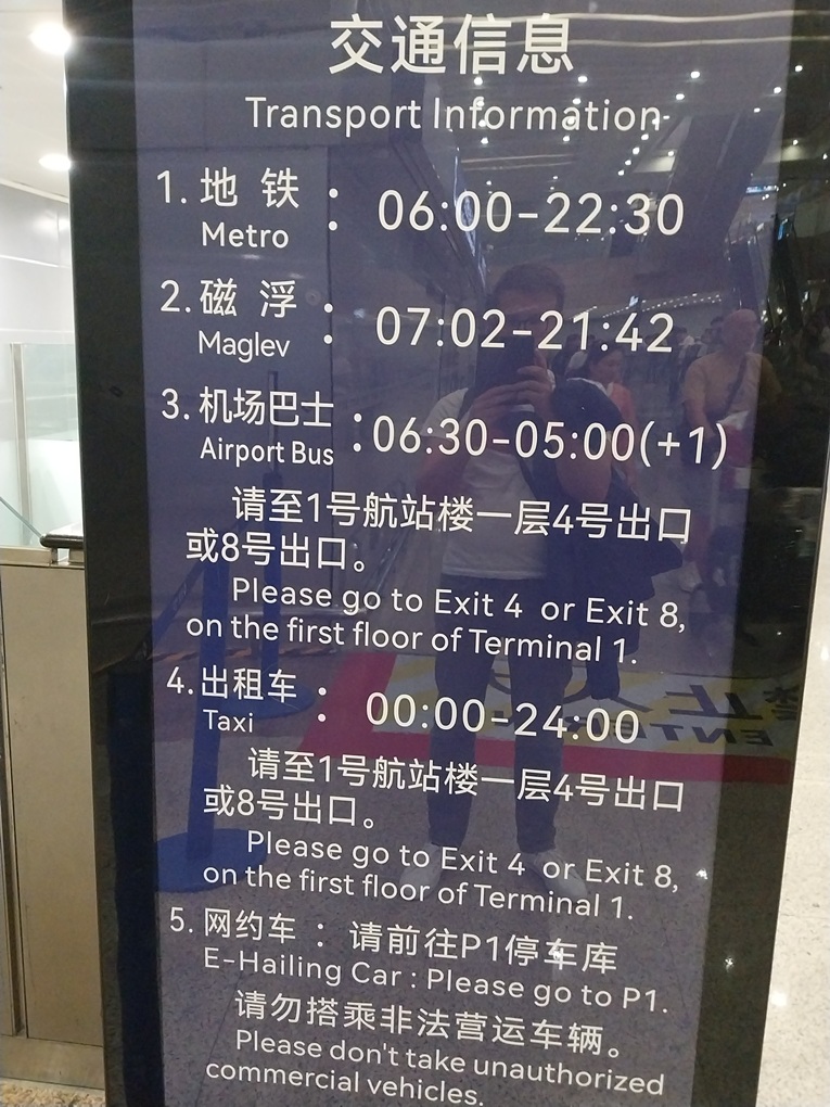 Zde informace o tom, jak jezdí metro a rychlovlak z letiště - metrem je to delší, ale jezdí déle a je to levnější, rychlovlakem Maglev naopak rychlejší a dražší, ale jezdí kratší dobu :):
